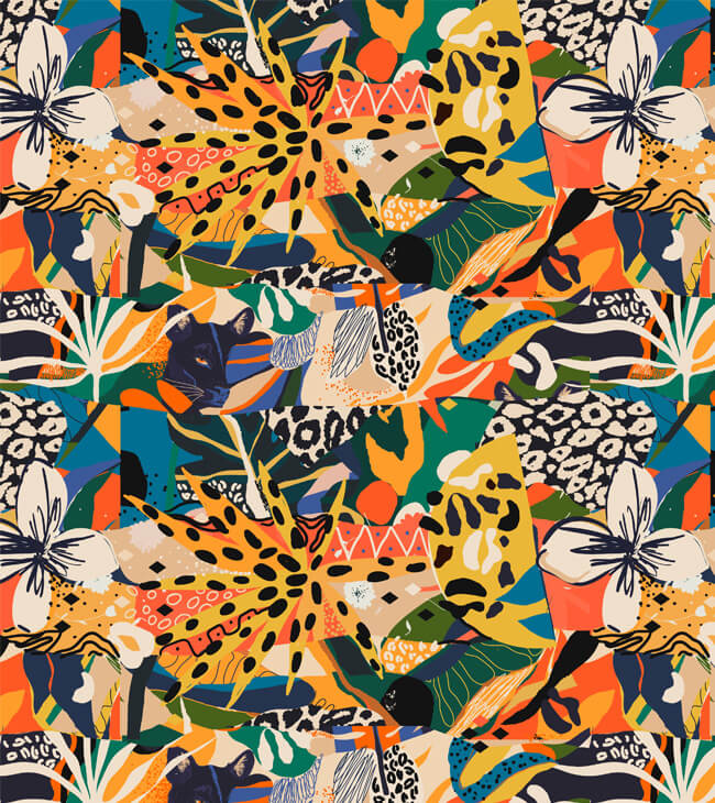A estampa MIX combina folhagens tropicais, flores, texturas de onça e elementos artísticos abstratos, criando um visual ousado, vibrante e cheio de personalidade. É uma estampa marcante, moderna e perfeita para quem ama peças únicas e impactantes.